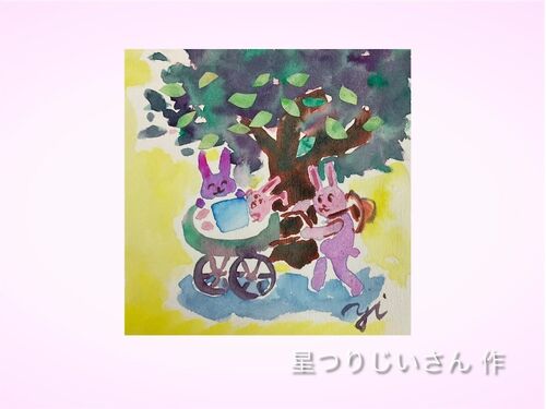 去年の夏の「星つりじいさん原画展とこどもアート展」で出品していた「お昼寝」。 本作は、初夏の木蔭で赤ちゃんを寝かしつけようとする家族を描いたのですが、木の葉っぱはたくさん貼っています。 「ここなら気持ちよく寝られるよ」という子への思いを表現…