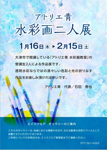 2025年早々、展示会のご案内です。 草津エイスクエアギャラリーで教室の受講生お2人による展示会を企画・開催します。 名付けて「アトリエ青 水彩画二人展」 出品作家 辻 葉多子、村田 雅子 期間 : 2025年1月16日〜 2月15日 会場 : 草津エイス…