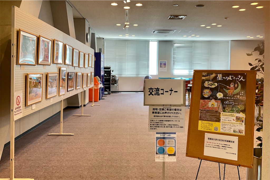 2025-07-18 石田泰也 原画展を開催中! Kids Atelier Blue こどもアトリエ青 展示会・個展 スカイプラザ浜大津での「ステージショー 星つりじいさん」連動企画「石田泰也 絵本原画展」を好評開催中です。 2025年8月3日(日)まで。 スカイプラザ浜大津のスタッフの方々には、色々とご尽力頂いてこのような機会を授かりましたことを、この場をお借りして心から感謝申し上げます🥲 挨拶文にあります通り、絵本というジャンルと、マジシャン シ・オ・ミ師匠へのオマージュによって出来ました。 展示会場からは素晴らしい夏の琵琶湖が一望出来ます。 ※ 全て終了しました。ありがとうございました☆